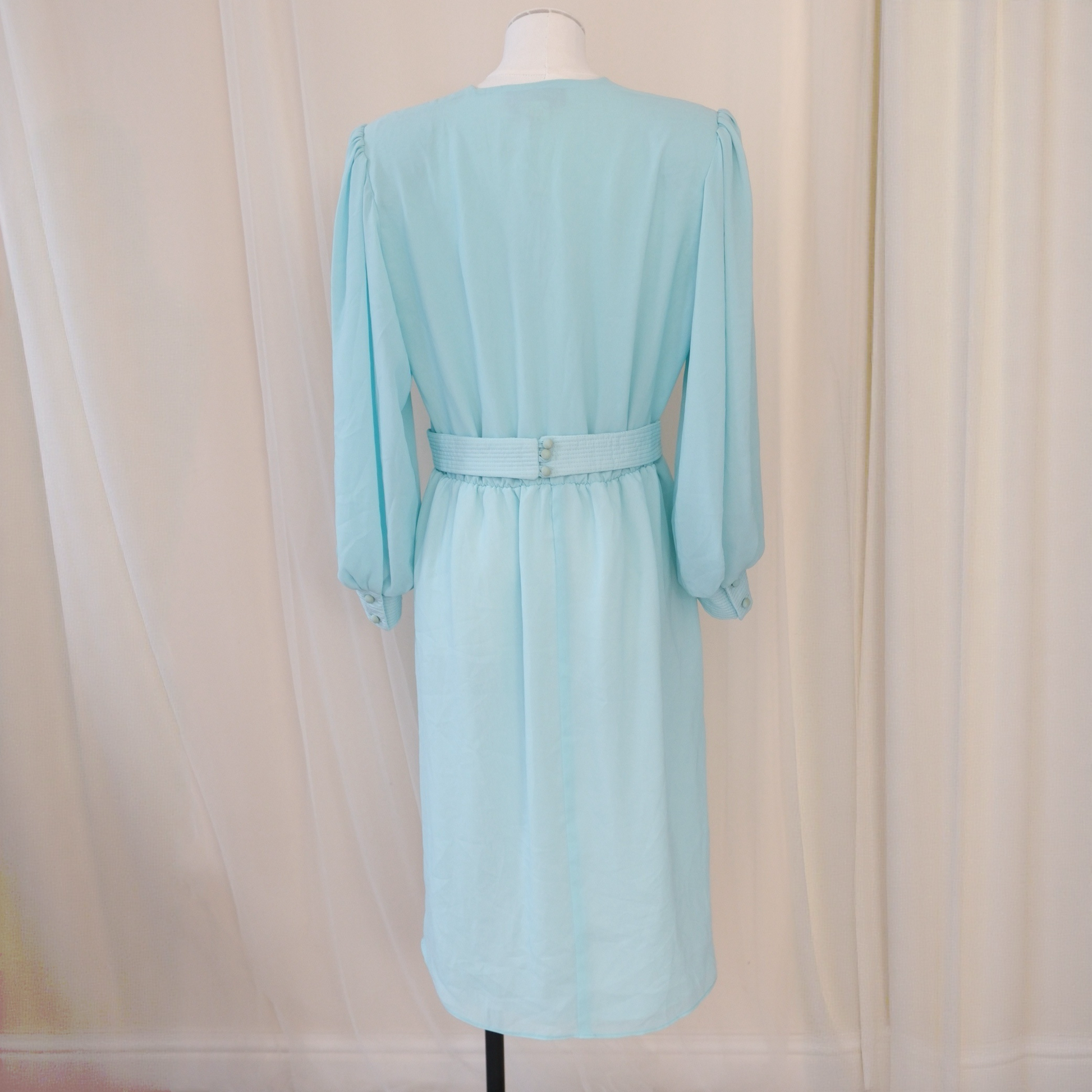 Float through any occasion in this stunning vintage Sandi Gale aqua blue chiffon midi dress, designed with a soft flowing silhouette and elegant long sleeves. Featuring a flattering deep V neckline, gently gathered bodice and a beautifully structured cinched waistband with fabric-covered buttons, this dress creates a timeless, feminine shape.