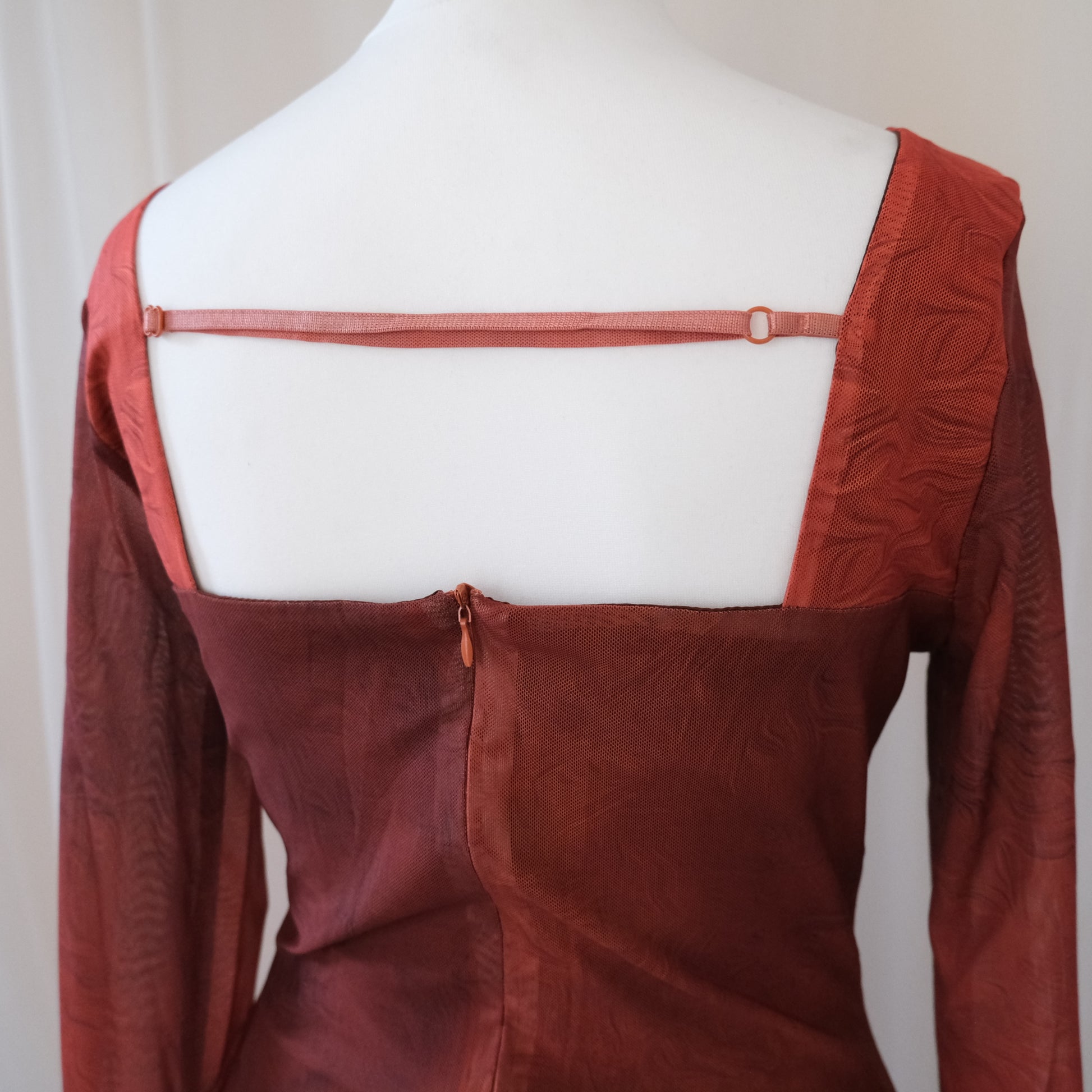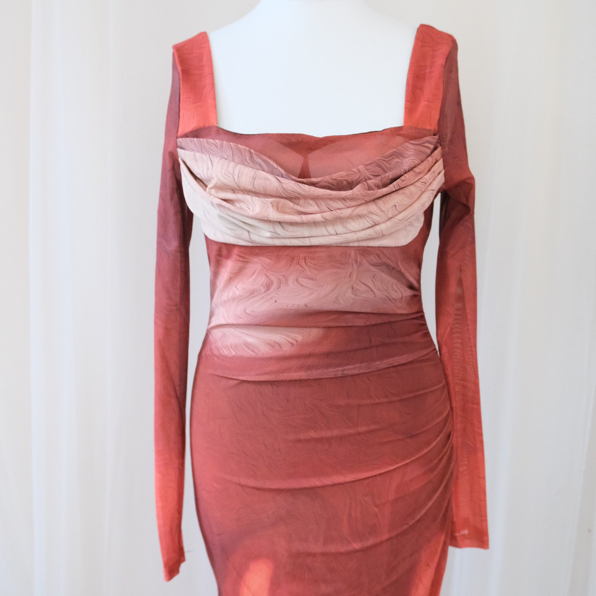 This stunning deadstock Y2K mesh bodycon maxi dress is the definition of sultry eveningwear from the early 2000s. Crafted from a sheer, swirled mesh fabric, it features a sculpted draped cowl bust, long sleeves, and a rust-to-rose ombré gradient that melts beautifully across the body. Feminine, flattering, and incredibly rare — a collector’s piece for true Y2K lovers.