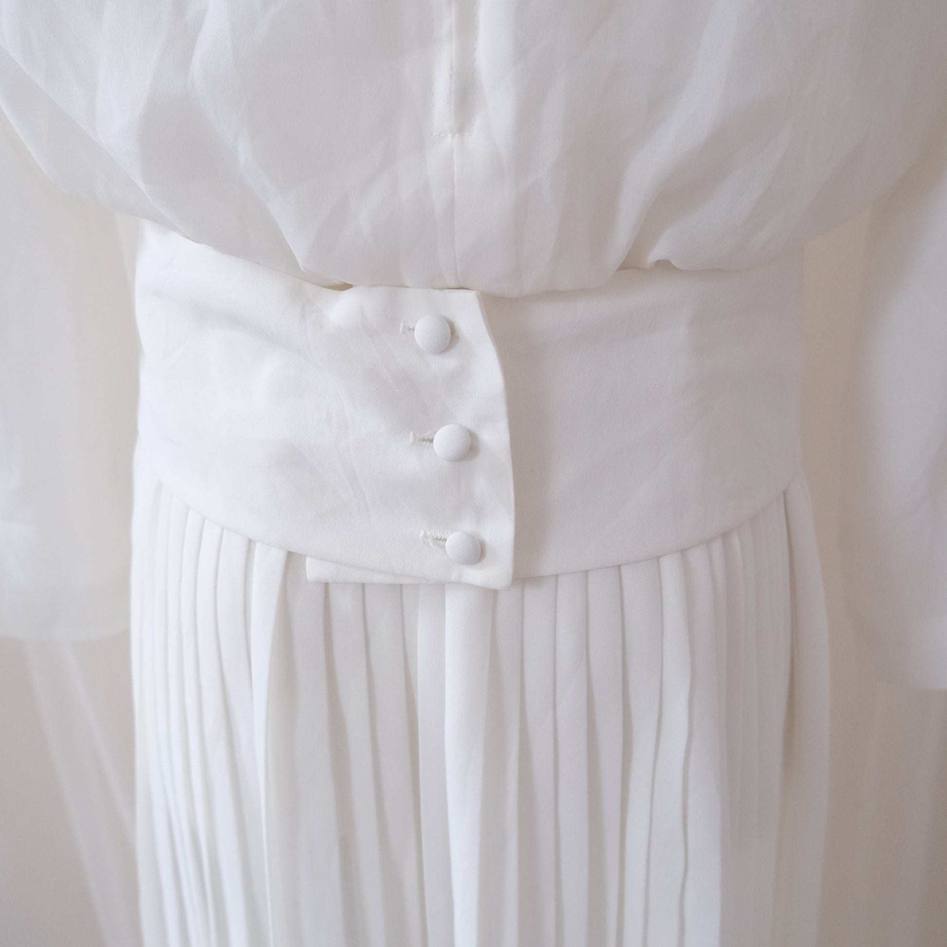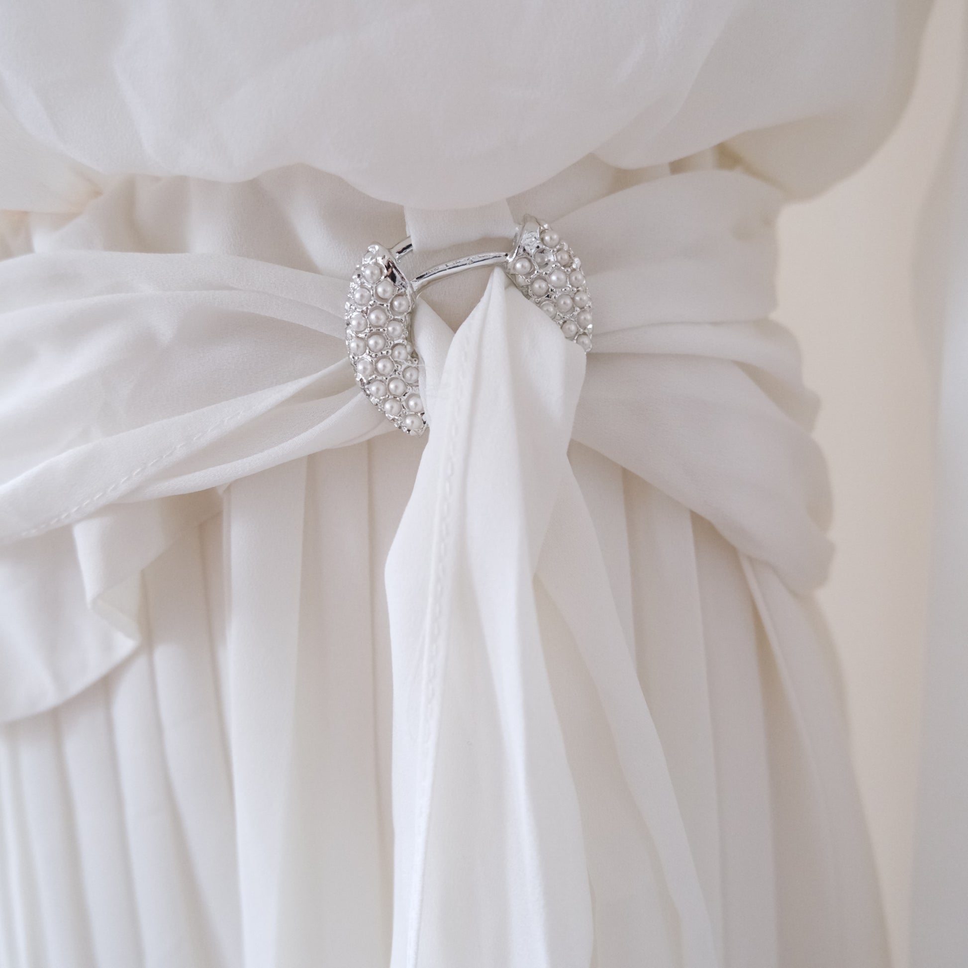 Step into timeless elegance with this stunning vintage Hewvy Lee white chiffon midi dress, beautifully crafted in the USA. Featuring a softly draped long-sleeve bodice, crisp pleated skirt and a flattering cinched waist, this piece is effortlessly romantic. The statement pearl-embellished buckle and flowing sash belt add a refined, bridal-inspired finish — perfect for special occasions, civil ceremonies or elegant evening wear.