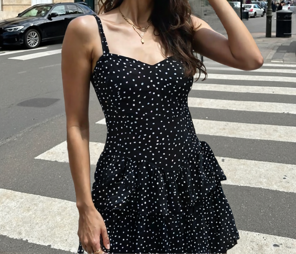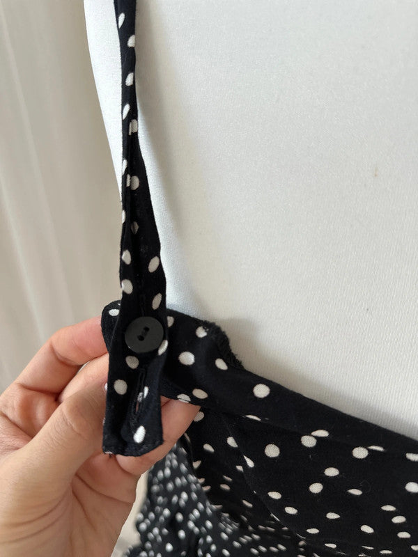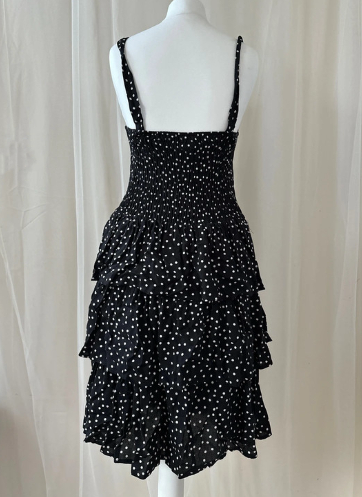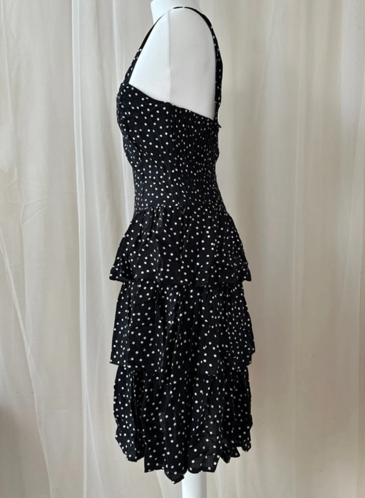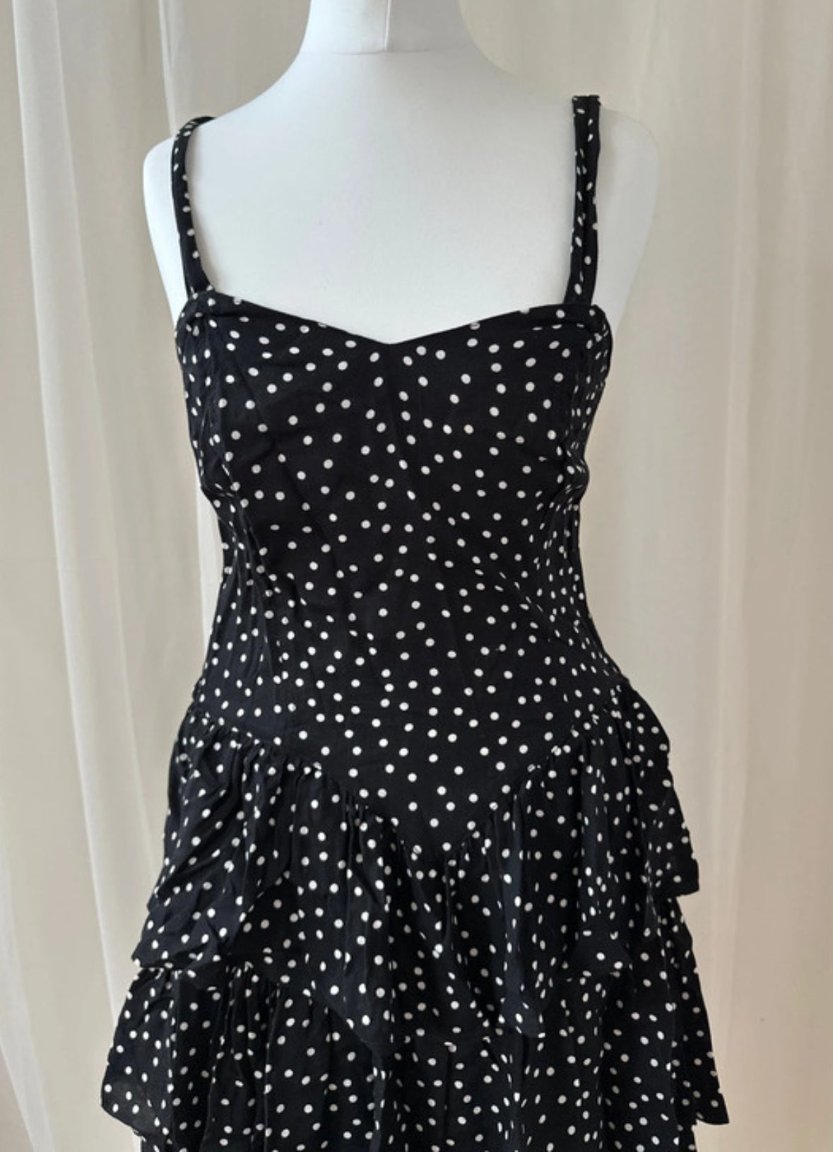 Super cute vintage polka dot mini dress. Black and white. Strap shoulder, heart shape neck line. Pull over style. Tiered bottom. A line. Adjustable button on the shoulder strap. Elastic upper body.