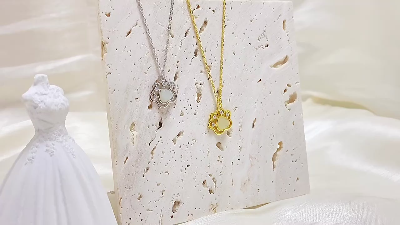 This Sterling Silver Jade Cat Paw Necklace is a playful and elegant piece that captures the charm of cats. Featuring a cute cat paw outlined in gold plating, it holds a smooth He Tian jade stone known for its calming energy. Perfect for cat lovers or anyone wanting a touch of peace and style, this necklace makes a sweet gift or a fun way to carry a bit of feline magic with you.