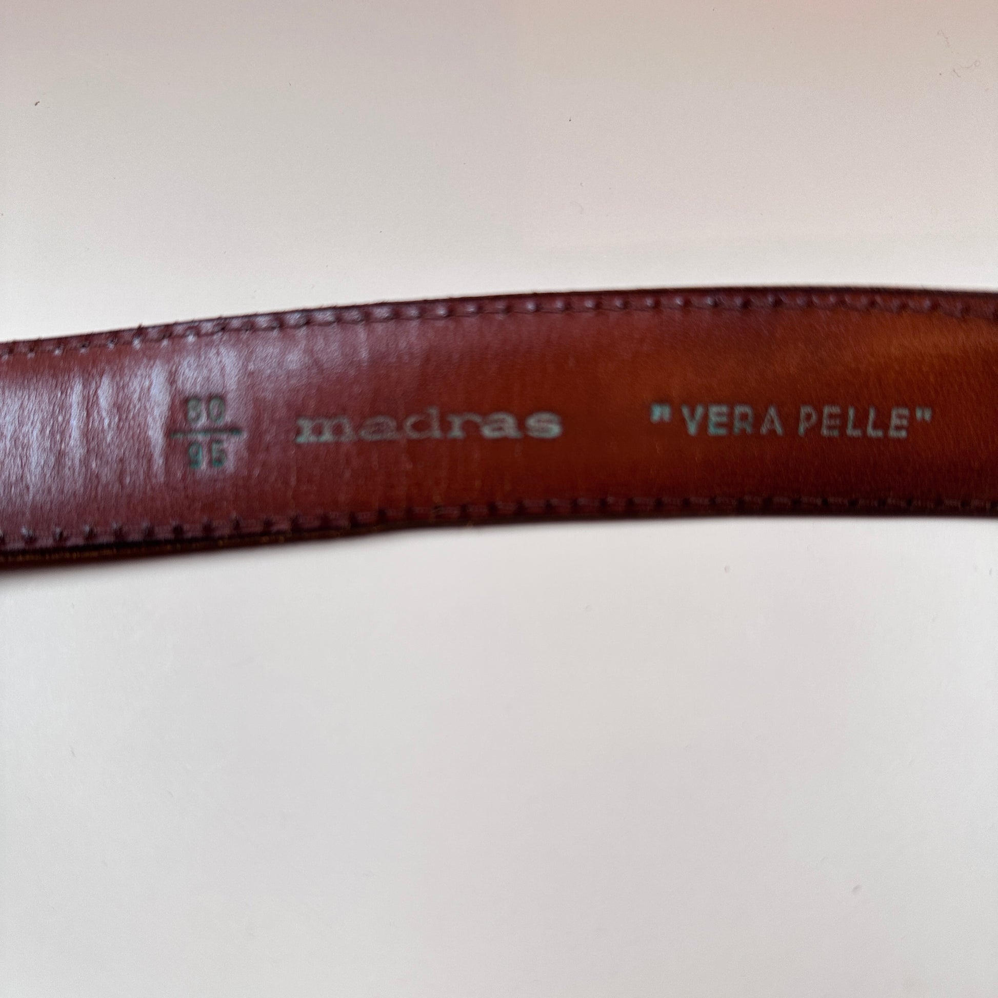 Add timeless sophistication to your wardrobe with this vintage Madras leather belt. The brown chestnut hue pairs perfectly with a polished gold-tone buckle, engraved with the Madras logo — a subtle mark of refined craftsmanship and enduring style.