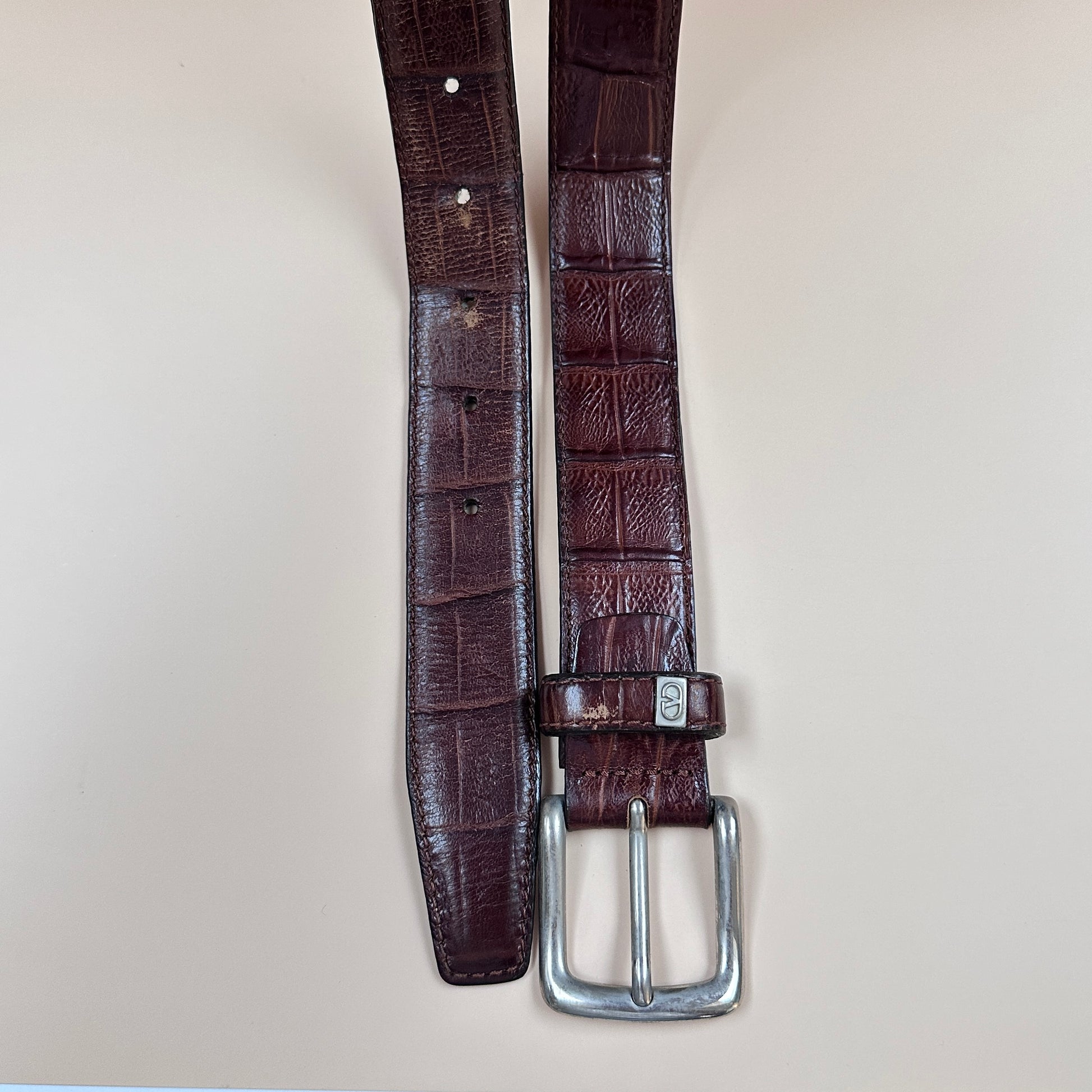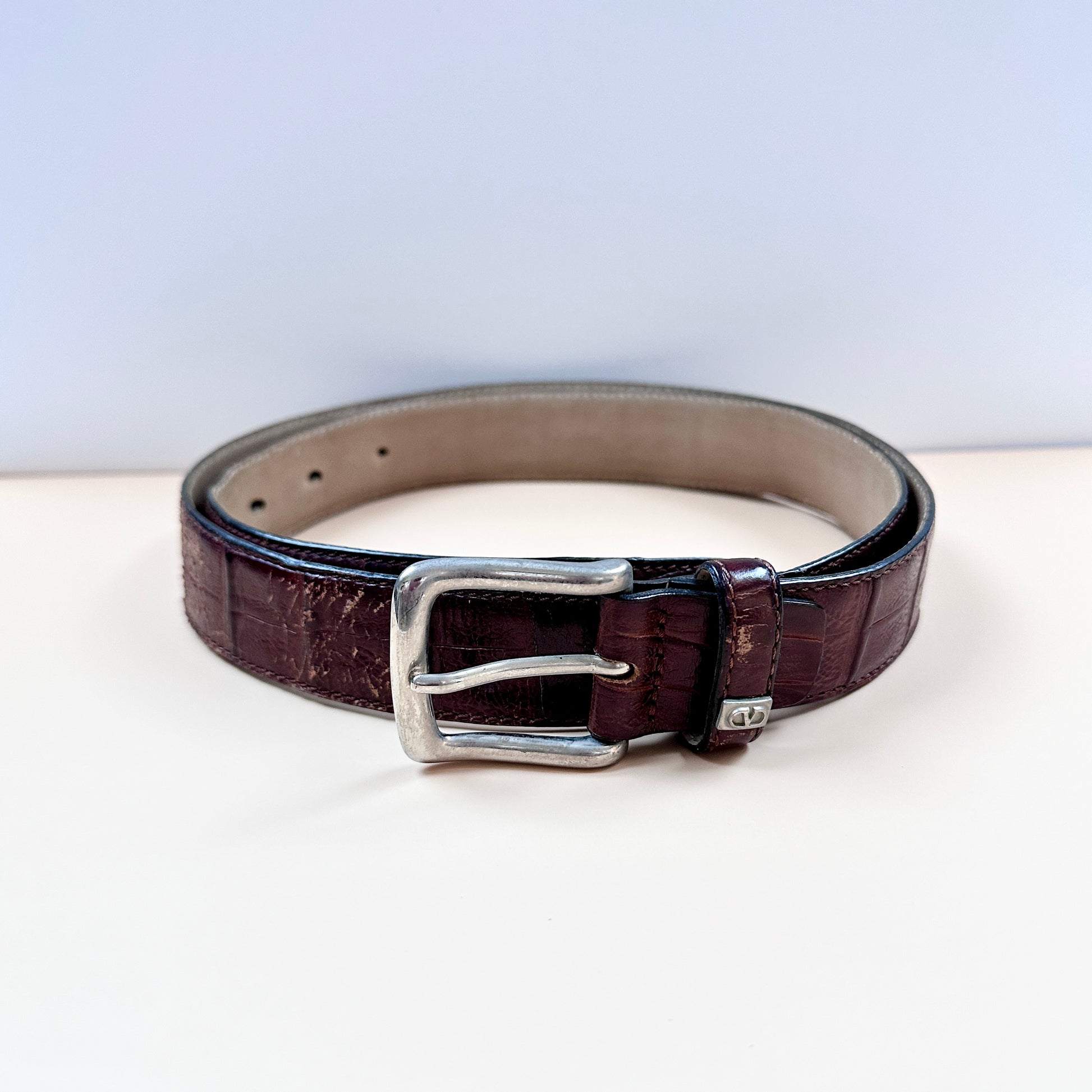 Elevate your wardrobe with this authentic Valentino vintage leather belt, a timeless piece that blends luxury craftsmanship with classic Italian style. Expertly crafted from genuine leather and featuring a rich brown croc-embossed texture, this belt is a statement accessory that exudes sophistication and heritage.